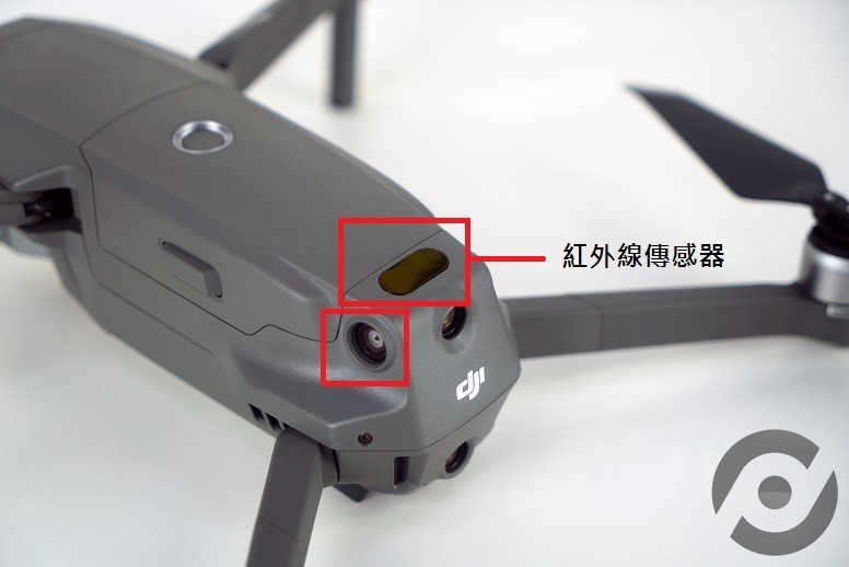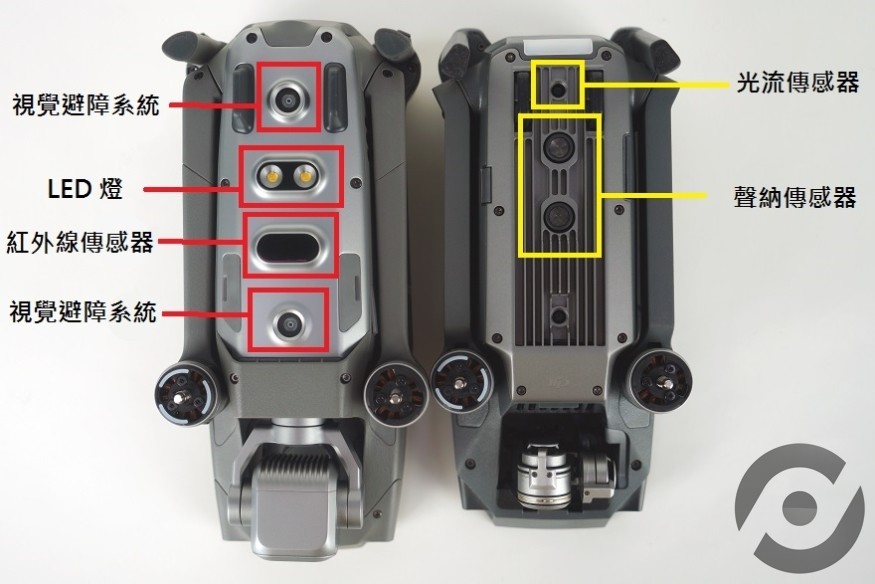 Mavic 2 Pro 的传感器远比 Mavic Pro 多,位置亦各有不同。 Mavic 2 Pro 机头两侧及机尾左、右、下方均设视觉传感器,机尾上方为红外线传感器、机身左右两旁设有只在「三脚架模式」及「智能跟踪」时方会开启的视觉传感器,底部撤去了 Mavic Pro 的声纳传感器及光流传感器,改为红外线与视觉传感器,机底同时新增了 2 个 LED 灯泡,可选择自动或手动开启,方便阴暗环境定位无人机及协助降落。