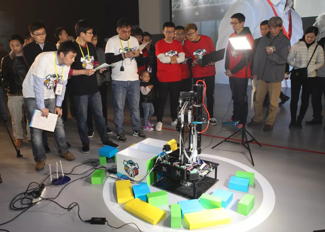 ▲ 第一届京东X机器人挑战赛上,参赛团队的机器人正在进行货品码垛