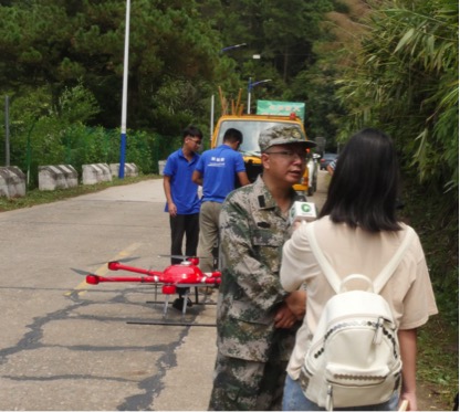 副区长马健娇、区委常委、人武部政委吴焯坚用无人机地面工作站查看抢险搜救被困人员,巡视山体滑坡情况。