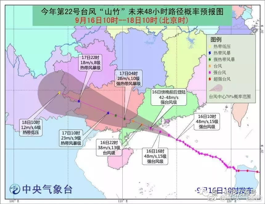 今年第22号台风“山竹”(强台风级)已于16日17时在广东台山海宴镇登陆,登陆时中心附近最大风力14级(45米/秒,相当于162公里/小时),中心最低气压955百帕。