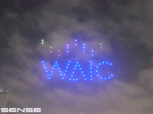 转瞬之间...集群编队宛如灵魂画手,大会logo“WAIC”辉映苍穹,利落而感性的笔触,篇首点题,简洁有力。