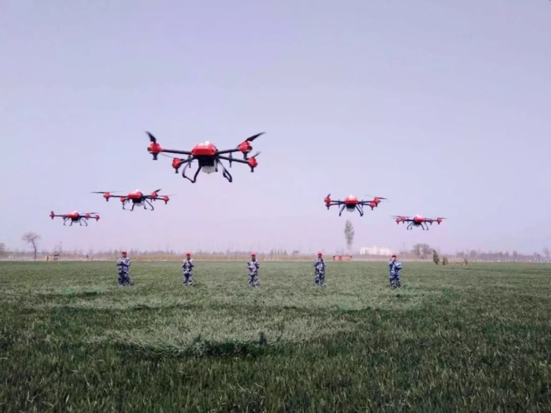 农田中,编队飞行的植保无人机