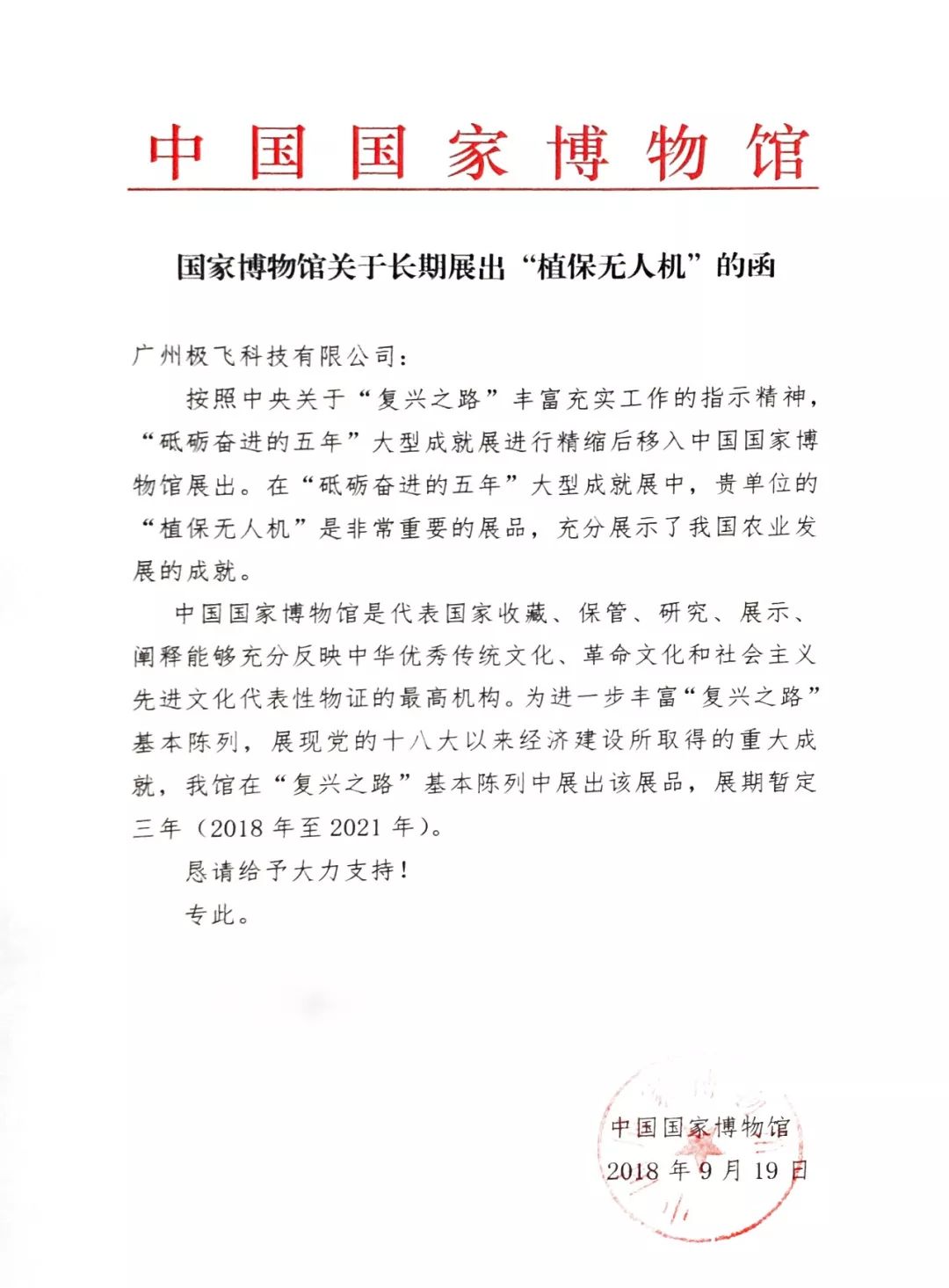 自古以来,农业活动推动着人类文明的演进,凝聚着世世代代劳动者的智慧。今天,极飞的植保无人机进入了中国国家博物馆,与 5000 年农业文明,一起见证农业对中国乃至世界的影响力。餐桌上、农田里,都有农业科技的影子,仲秋时、丰收节,印着农产者的脚步。感谢国家博物馆对每一位农业科技从业者、每一位农人的肯定。