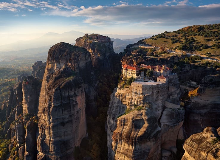 米特奥拉是位于希腊特里卡拉州色萨利区众多修道院的总称。这些修道院雄踞于一座座巨大的山岩的顶点。这些巨大的山岩从广阔的塞萨里亚平原拔地而起,有的超过400米,它们形状各异,色彩不一。