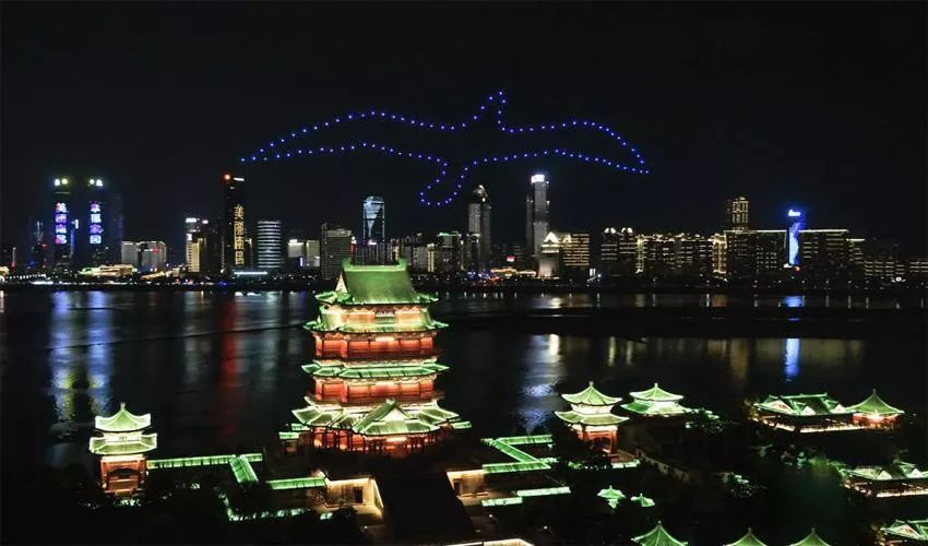 表演中无人机编队绚丽的造型、古色楼阁、潺潺赣江水以及红谷滩对岸高层建筑群都尽收眼底,缤纷绚丽、灿若星辰,视觉效果令人震撼。