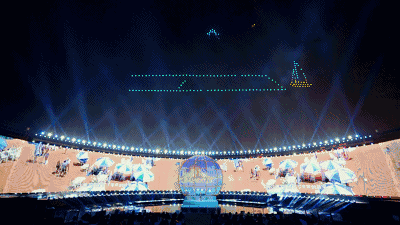 上百架无人机搭配绚丽激光一起“空中开花”,呈现超乎想象的光影效果。