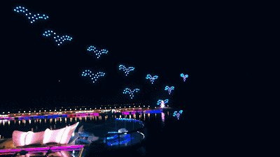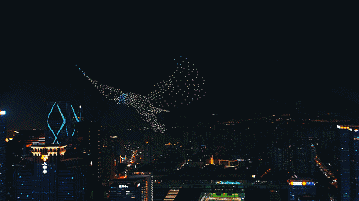 无人人机音乐秀,搭配福田中心区绚烂的灯光,展现出“大鹏展翅”与“月圆中的芭蕾舞”等3D造型,献礼改革开放40周年,献礼祖国第69个生日!