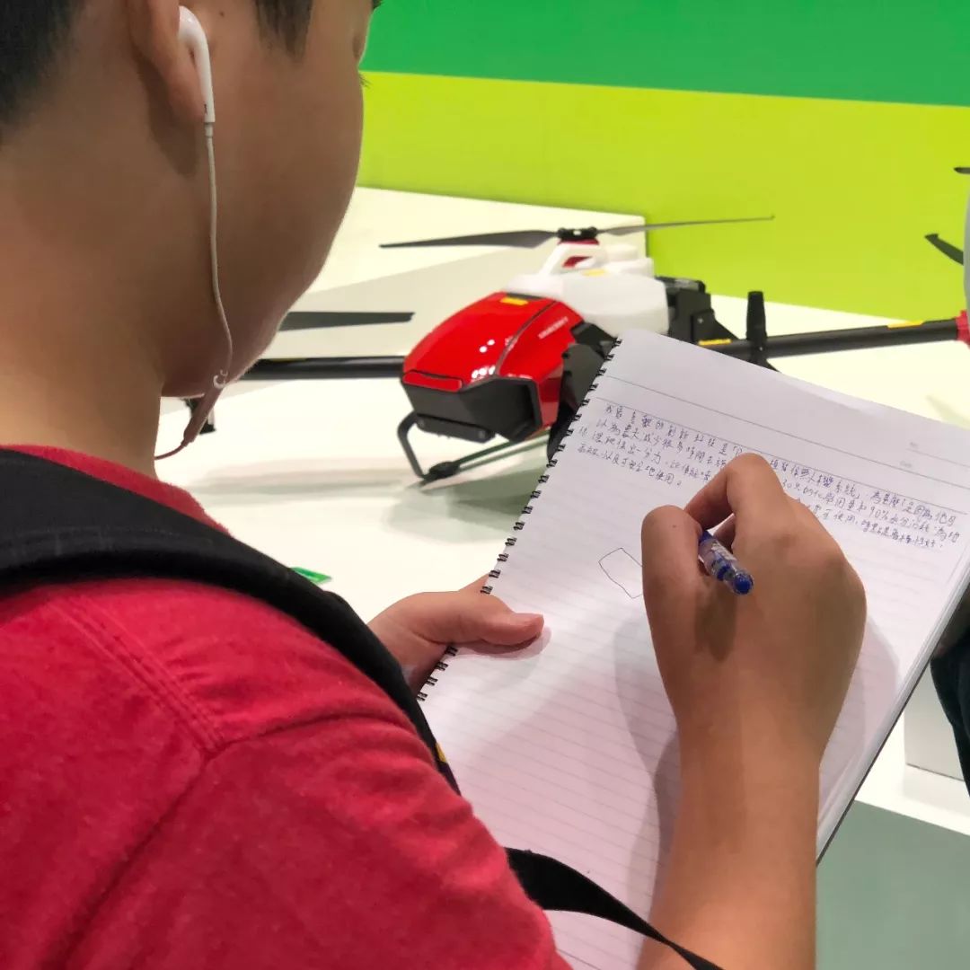 喜欢 P 系列植保无人机的小朋友在导赏员讲解时详细地记着笔记