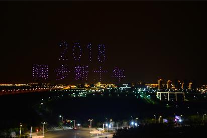 盛会现场人声鼎沸,无人机整装待发,预备为深沉的夜空增添一笔炫彩的光点。表演当晚,在各方领导及现场记者和众多观众的注目下,无人机最先幻化成一只象征美好的海鸥,海鸥展翅飞翔,穿过“10”,变成莲花,一起组成中新天津生态城的十周年专属LOGO。现场响起一阵欢呼!光影之间,无人机垒起一座具有地标代表性的建筑“天津彩虹大桥”。随着无人机灯光的变换,彩虹桥蜿蜒且充满希望地延伸向远方,连接起两地的深厚友谊。五光十色中,一尊新加坡鱼尾狮显现了,带来灵动的气息,串联起开放、友好、进步的平台。最终,空中将绽放“2008-2018不忘来时路,阔步新十年”字样,现场沸腾了!这,是一幅总结过去的满意答卷,也是一颗炙热的心,饱含了对未来的期待与憧憬。