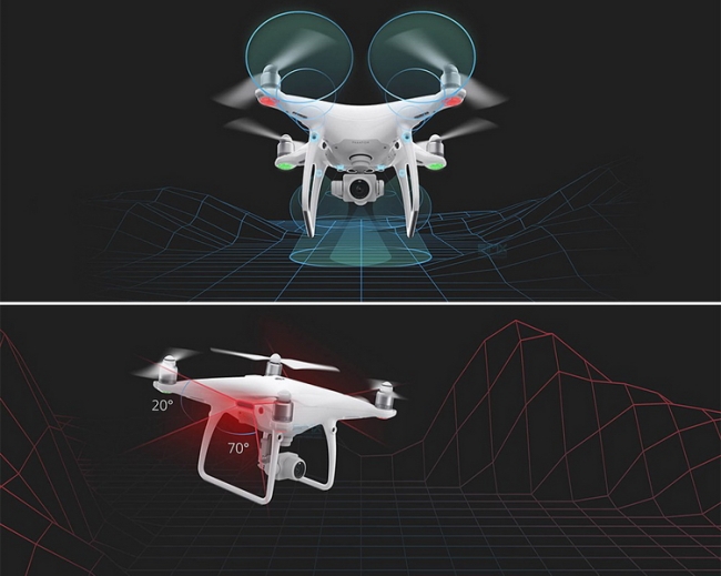 上图是精灵4pro搭载的5向避障图示,机身上的摄像头也多了7个;下图是机身左右两侧红外感知模组感知范围图示,精灵4pro可以实现上下20°、左右70°、最远距离7米的感知范围。