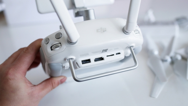 遥控器底面有USB接口、HDMI接口、内存卡槽和microUSB接口,精灵4pro的USB接口不支持接入其他的移动设备,拍摄画面是通过HDMI接口实时输出,而新增的内存卡槽则是用于存储5.5寸高亮显示器的系统文件。