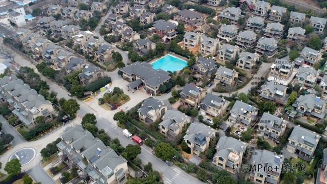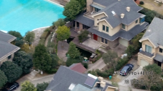 航拍的一个别墅小区,照片分辨率为5472*3078,约在110米高度拍摄,局部放大后细节还是不错的,有点涂抹感,如果降低飞行高度就可以得到更清晰的画面。
