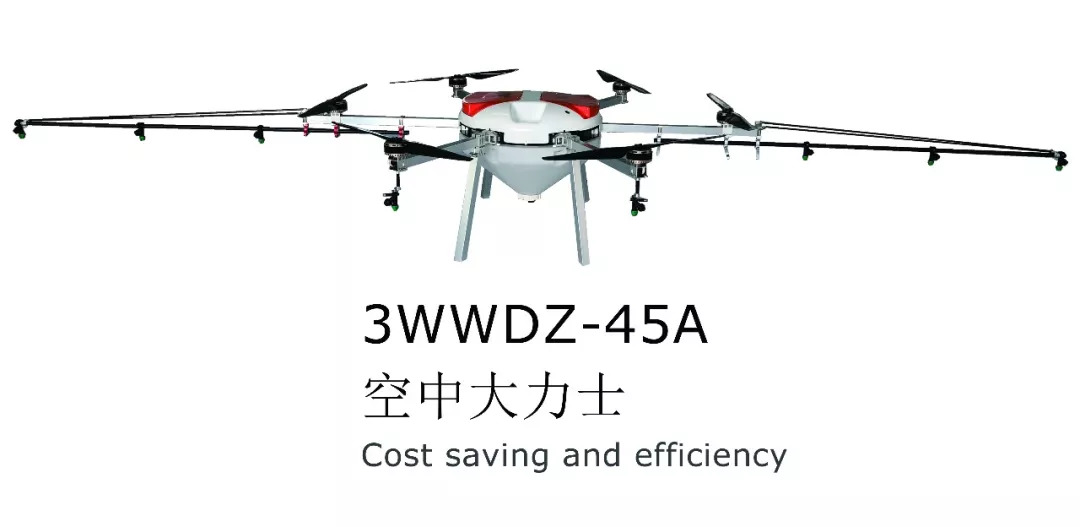 3WWDZ-45A是一款多功能农用无人机,最大作业载荷45kg药剂或颗粒粉剂。以六旋翼电动无人机为飞行平台,通过快速更换不同功能的挂载设备实现多种作业需求,如植保喷雾、辅助授粉、田间运输、农作物勘察、肥料播撒、种子播撒等。根据不同作物,还可自行调节喷洒流量,飞行速度,高度等。作业喷杆与整体支撑结构融为一体,喷头置于旋翼的下方,工作中螺旋桨的下洗气流可以很好的增加喷施药剂的穿透性,同时促使农作物摆动,叶片的正反面均可着药,提高施药效果。