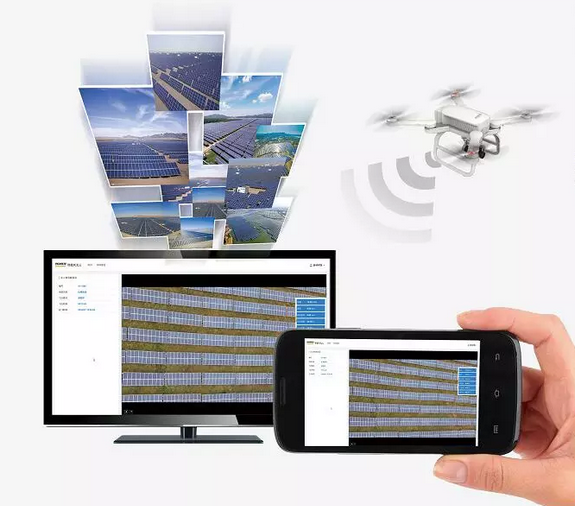 最值得一提的是全新突破的云直播功能,配给的光伏组件智能诊断系统与风光云智能管理系统,可实现同步监控多台无人机巡检、异地实时观看巡检过程。如位于上海总部的工作人员,可通过云直播观看甘肃电站巡检过程,根据具体情况通过手机、PAD展开下一步操作。