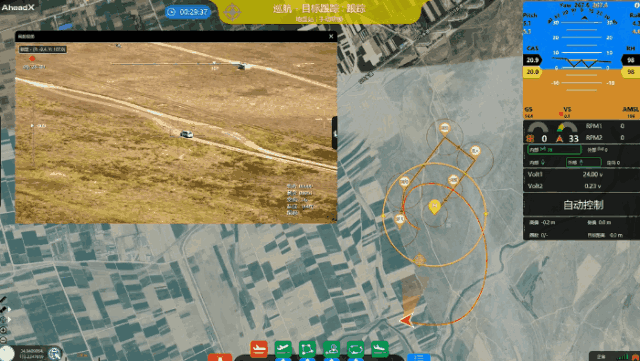 飞机起飞后,在目标搜索区域盘旋待命,控制吊舱改变视角并未发现目标,无法得知目标具体位置的情况下,AheadX智能搜索模式开始大显身手。