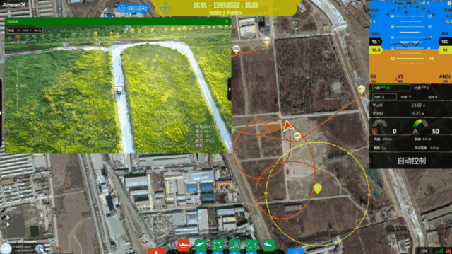 当无人机发现并锁定目标后,需要无人机实时跟随目标飞行,在固定翼跟飞应用中,当锁定目标点后,AheadX跟踪模式将控制无人机将以最快最优的方式靠近目标点,当进入目标点跟踪范围后,无人机会在目标点上空进行盘旋跟踪。