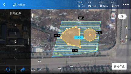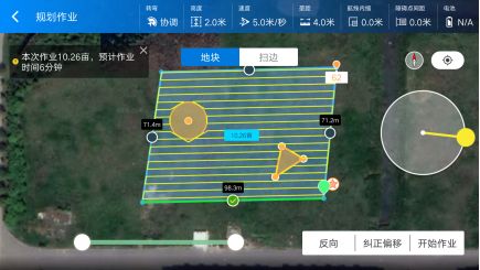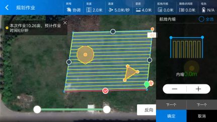 在航线规划页面中有很多可设置自主作业的参数。如转弯方式、高度、速度、垄距、航线内缩、障碍点外扩、航线角度、起始边起始点、纠正偏移(航线纠偏,参照点纠偏),扫边(留边距离)等,可选择部分航线进行作业。