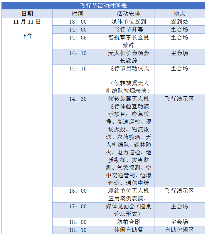 11月11日,全国首届国际无人机飞行节即将在深圳举行,此次活动由智航无人机为发起单位和承办单位。主要是通过此次飞行大会现场模拟实战中各种应用场景和飞行作业任务情况,来展示行业级无人机的性能和用途。演示项目包括:应急救援、高速巡检、现场抛投、物流派送、农药喷洒、无人机编队、森林防火、电力巡检、地质勘探、灾害监测、气象探测、空中交通管制、边境巡逻、通信中继等。同时,本次无人机面向全国所有的行业级无人机厂商,欢迎各大厂家携公司产品参加此次飞行演练秀。