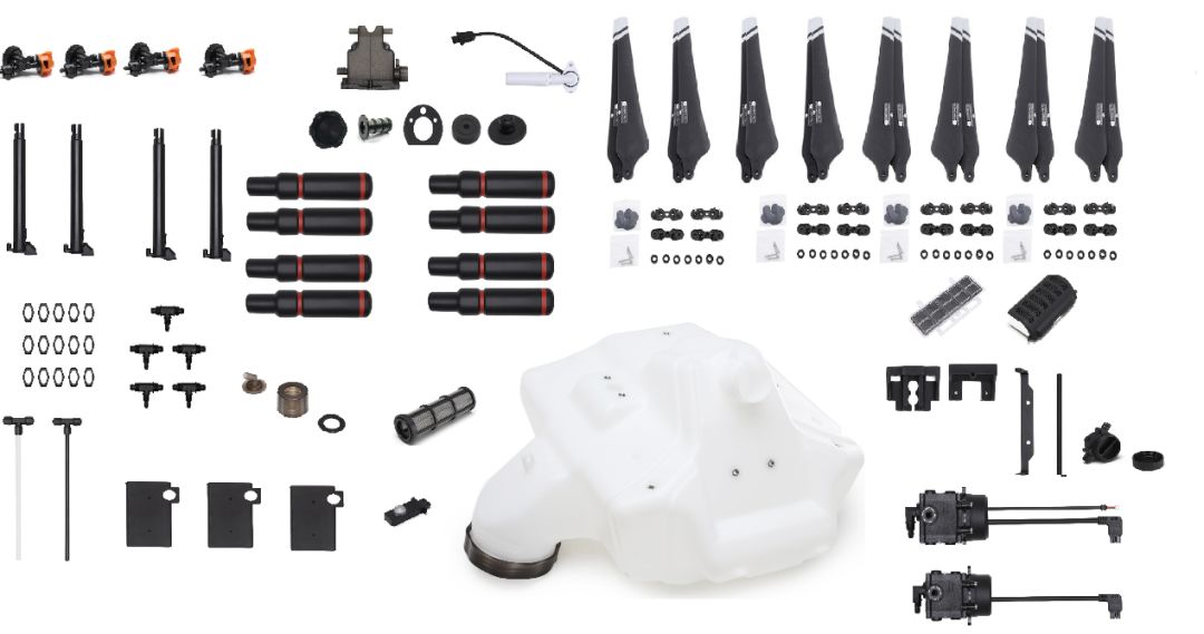 MG-1P 需拆开清洗部分包括:喷头固定杆、喷头(泄压阀、橡胶垫、喷嘴)、桨叶、桨夹(垫片)、水箱、水箱出水口过滤网、水箱加药口过滤网、液位计、水泵、泵座套、过滤网挡片、脚架减震器、管路固定底座等。