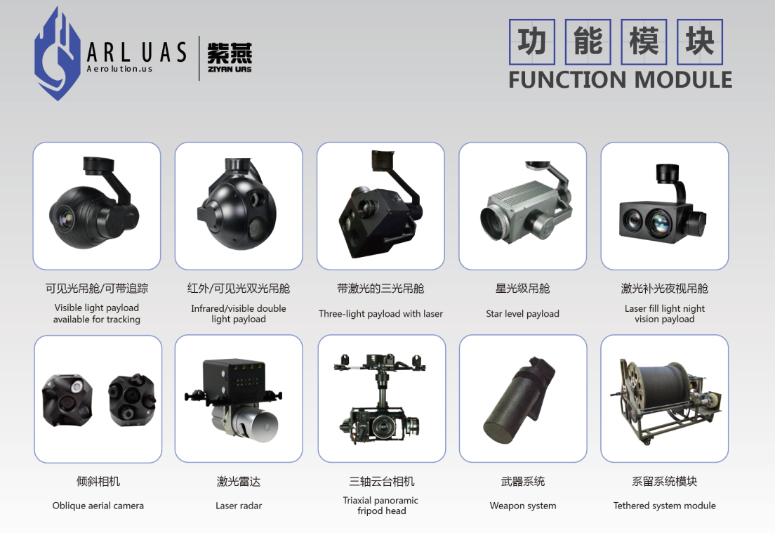 搭载的吊舱可以灵活多样,包括30倍可见光吊舱、红外热成像双光吊舱以及其他设备。