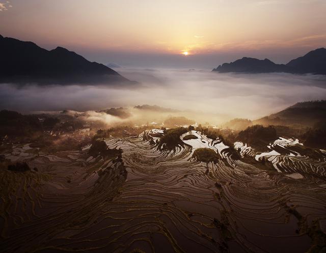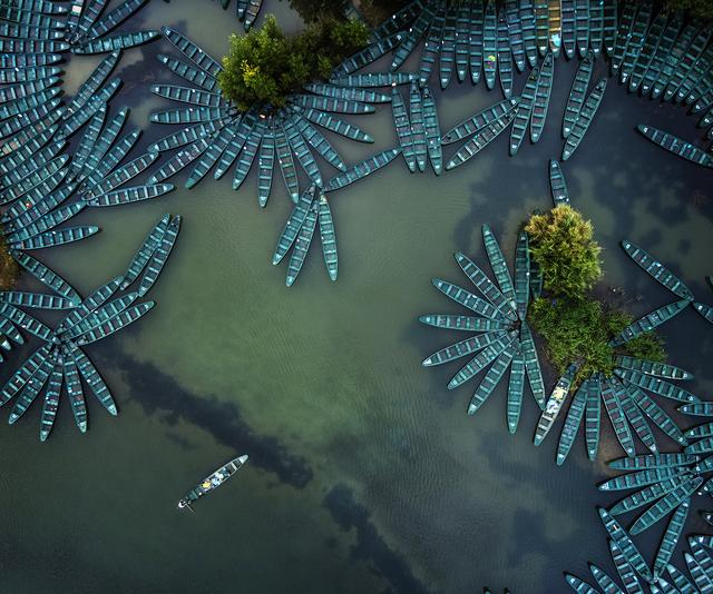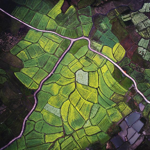 消失点构图意境悠长。透视的规律告诉我们近大远小的自然现象,所以在远方,可以看到平行线汇聚于一点,这个点被称作为消失点。多选择这类的画面构图,不但可以让画面更具冲击力,而且平行线条会将观者视线导向消失点,使其增强画面空间感。这种技法在我们的航空摄影中极具优势,因其的自由的飞翔给我们的创作提供了无限的空间。