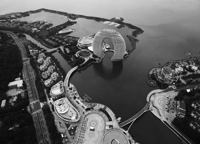 向心式构图有万向引力之功,具有突出主体的鲜明特点。主体处于画面中心位置,而四周景物随即向中心聚集,观者的视线瞬间被引向主体中心,起到强有力的聚集焦点作用。此类构图法较适于航拍城市建筑。