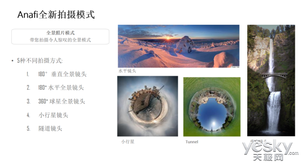 对于无人机小白来说,“自动模式”尤为重要,毕竟刚刚上手时很多功能和操作还不熟练,也没有娴熟的拍摄技巧,此时就需要“傻瓜式”操作来解决这一问题。这就要提到PARROT ANAFI将会在11月22日升级全新功能的FreeFlight 6 APP了,它会带来180额度垂直全景、180度水平全景、360度全景球、隧道和小行星共5种全景模式,小白们也能拍出视觉大片了。