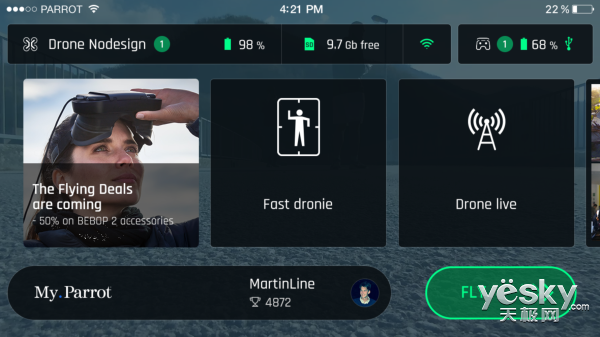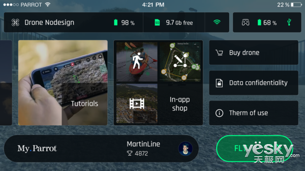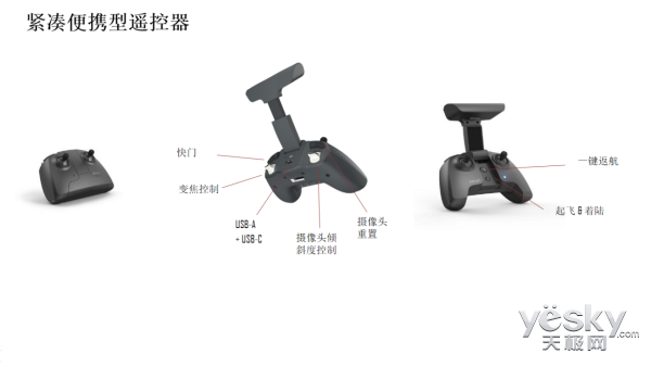 Parrot Skycontroller 3遥控器折叠起来犹如一个游戏手柄,手机支架可根据手机进行自动扩展或收缩,保证手机稳固的定在支架上。遥控器上继承了众多功能,比如快门、变焦控制、摄像头倾斜角度,摄像头重置等,更有一键返航和一键起飞或着陆按键,即使是第一次操控无人机的笔者,也能很快上手,可谓是我等“无人机小白”的福音。