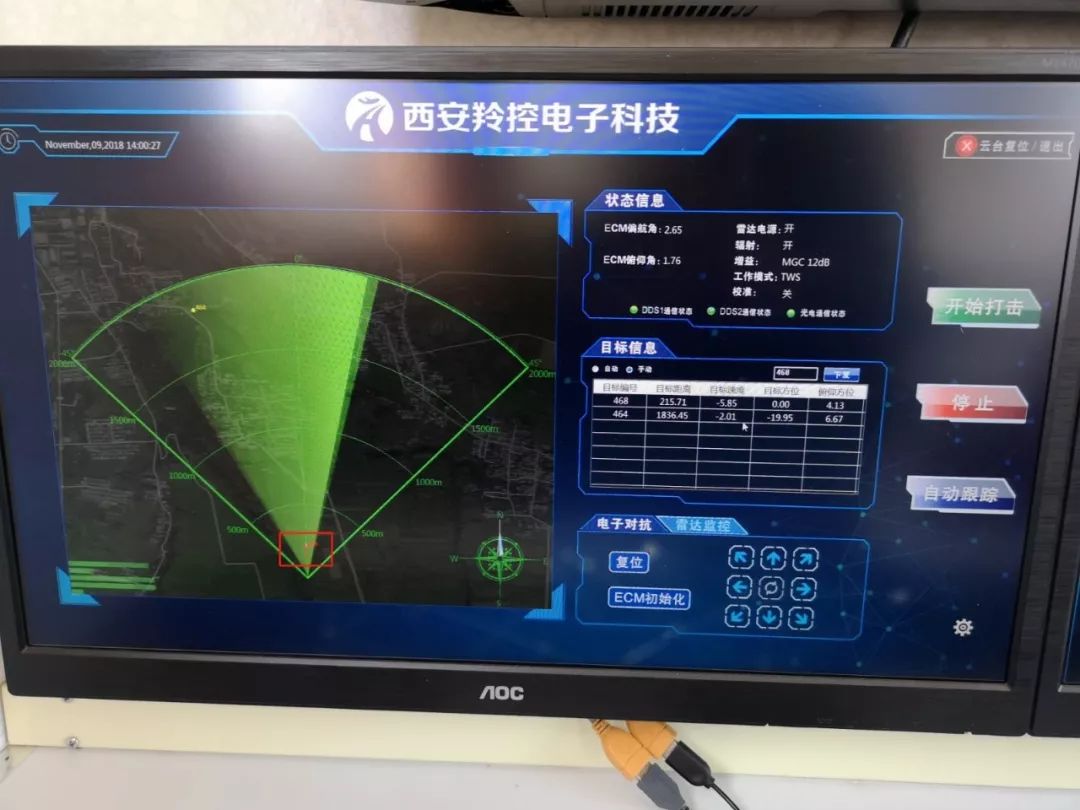 在详细的介绍之后,随着羚控科技工作人员一声令下,另人期待的反无人机安防系统展示正式开始。雷达、光电、电子对抗等反无人机系统组件进入备战状态。一旁,羚控科技安防部飞手操作无人机缓缓升空,在确认图传、数传、GPS信号等各项通信正常后,操作无人机进入布控区域进行入侵。雷达实时扫描后很快的发现了入侵可疑目标,并将目标的距离、方位角、俯仰角等信息下发给光电子系统。与此同时,光电子系统根据雷达下发的目标信息,跟瞄无人机,最后,由工作人员下达攻击指令,电子干扰系统对目标进行打击,切断飞手和无人机之间的导航、图传、数传等信号,迫使无人机降落。