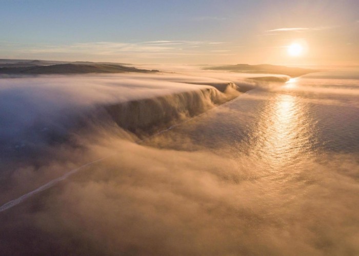 无人机航拍–West Bay, Dorset, UK. "A beautiful foggy sunrise on the Dorset Coast"