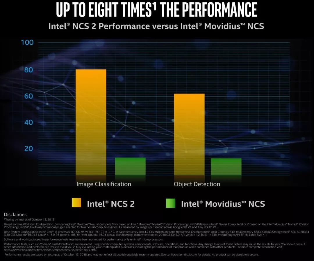 Intel称,NCS 2的性能比之前的第一代产品有了极大的提升,其中图像分类性能高出约5倍,物体检测性能则高出约4倍。