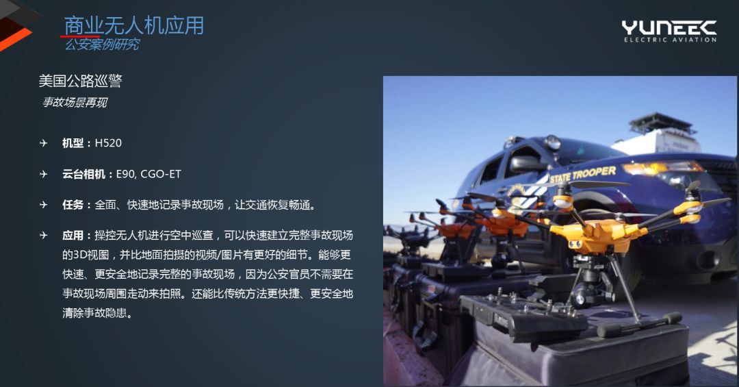 “以美国公路巡警案例为例,Yuneec Typhoon H520型号的无人机,可在发生事故后的短时间内赶往现场,全面、快速地记录现场。通过H520的云台提供的稳定性,使H520可以快速建立完整事故现场的3D视图,并比地面拍摄的视频/图片有更好的细节。能够更快速、更安全地记录完整的事故现场,因为公安官员不需要在事故现场周围走动来拍照。还能比传统方法更快捷、更安全地清除事故隐患。”