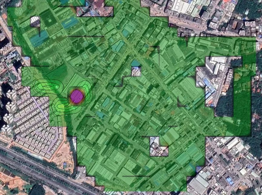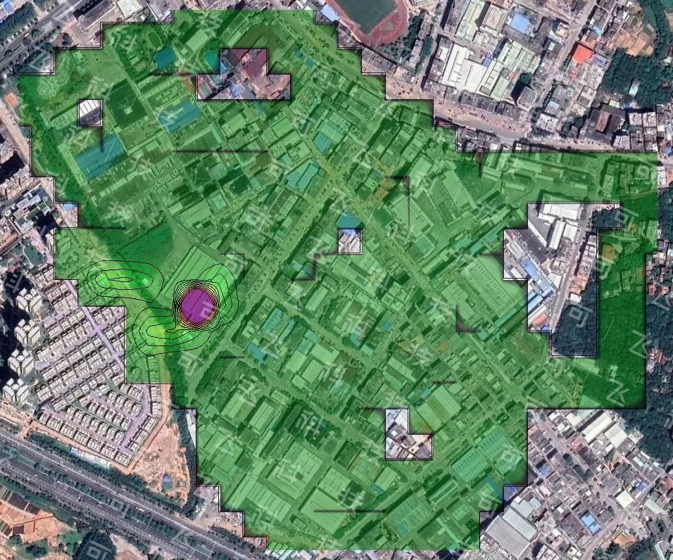 “灵嗅”绘制出的工业区VOCs等值线浓度图,紫色位置即为浓度异常区域