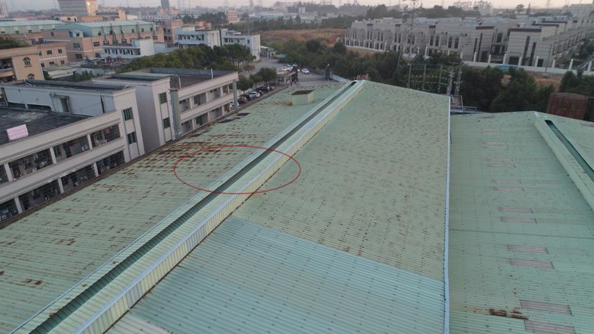 飞手操控无人机抵近拍照,此位置是一工厂厂房,厂房顶部有一排换气孔。现场执法人员推测,该厂房内部有大量VOCs无组织排放,经厂房顶部的换气孔直接排放到空气中(下图红色标记部位),疑似为周边小区异味的源头。