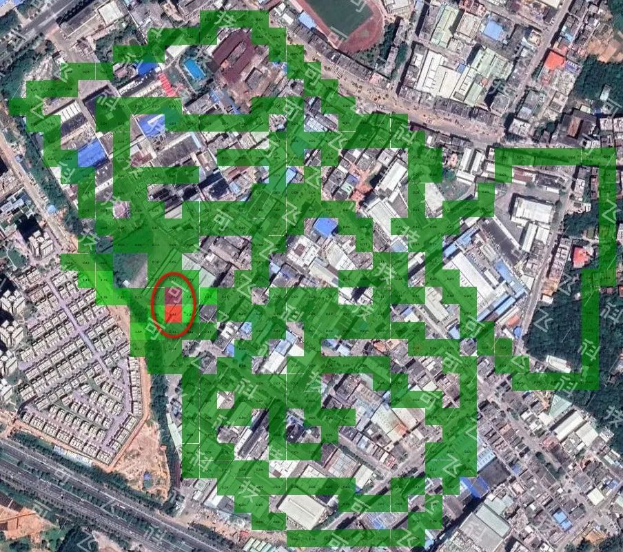 排查过程中,当搭载“灵嗅”的无人机飞越一工厂厂房上空时,VOCs浓度急剧上升,瞬时浓度最高值达35ppm(该工业区的背景VOCs浓度不到0.1ppm),该位置附近区域PM2.5数值也明显偏高,单点浓度最高值达196.0ug/m3。从上图可以明显看出浓度高点的具体位置(红色圈出部分)。