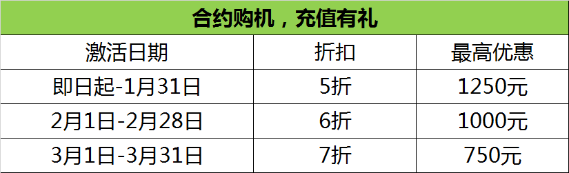在以下时间内完成激活,还能获得充值优惠。(指定折扣券,每台合约机限用一次)