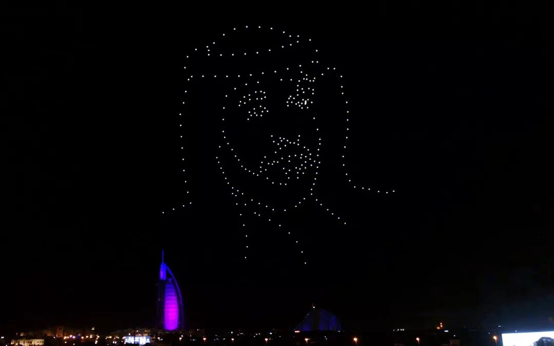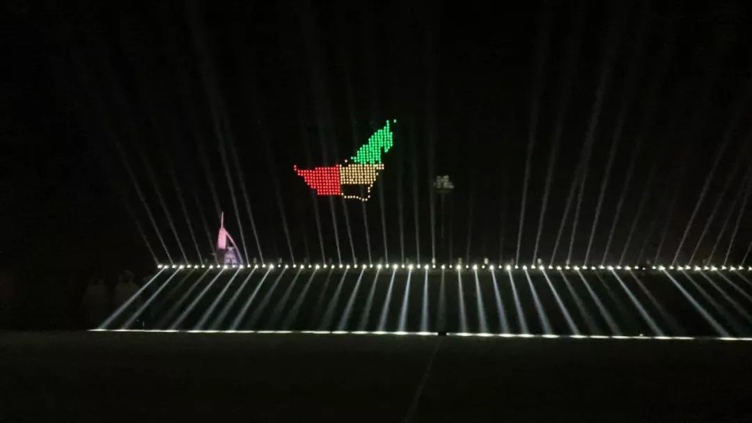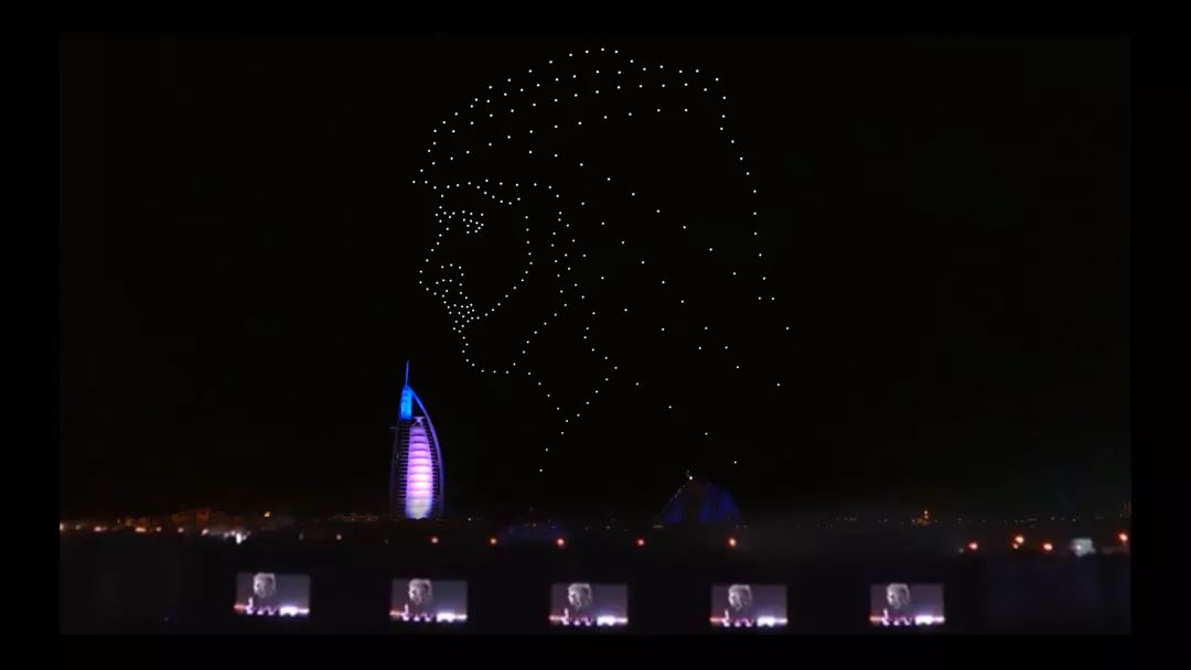 在迪拜王室和警方代表以及众多重要嘉宾的见证下,无人机伴随灯光及音乐全部整齐起飞,在夜空中先后组成了迪拜现任酋长、迪拜王子等肖像,以及阿拉伯文字等,无人机灯光与远处的帆船酒店灯光遥相辉映,灿若星河,场面甚是壮观。