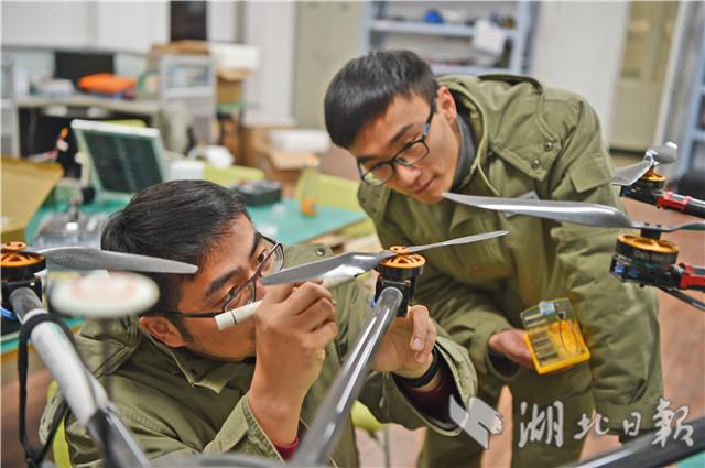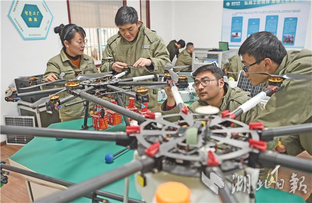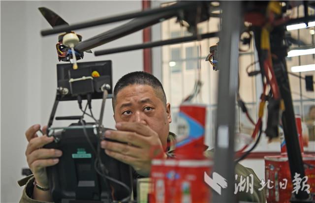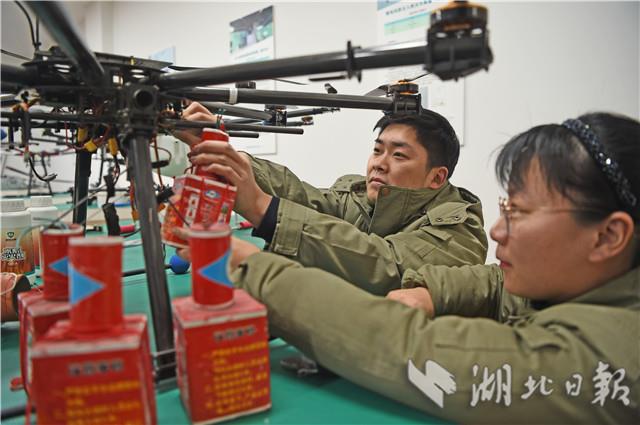 国网湖北省宜昌供电公司“智慧输电创新工作室”员工正在检测新研发的电力设施消防智能无人机。