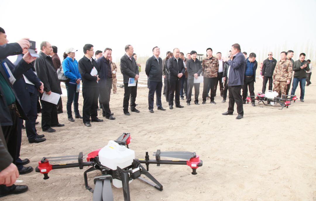 自治区党委农办副主任、厅党组成员、副厅长徐涛、尉犁县委常委、统战部部长帕尔哈提·吾买尔、尉犁县委副书记、县长艾尔肯·莫合木提、尉犁县农业农村局局长张晓冬等领导莅临现场,极飞工作人员为各位领导介绍了 P 系列植保无人机全自主作业及精准喷洒的特点。