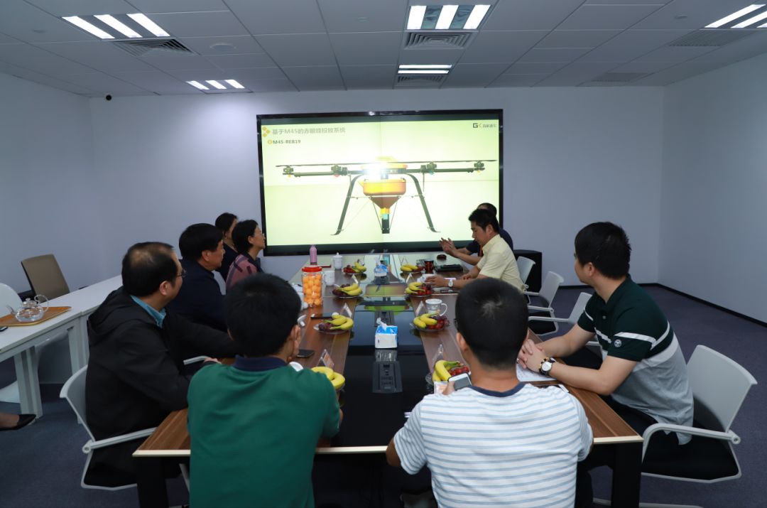 会上,高科新农技术带头人付总向兰教授团队介绍了过去一年高科新农所取得的产品创新成果。2018年,高科新农不断技术创新,产品升级。打造出了全新净载荷20公斤级农用多功能无人机M45,这款产品最大的优势就是智能化程度高、多种功能(喷药、喷粉、撒颗粒)、可靠耐用。目前市场上,集喷药、播种、施肥这三种功能为一体的大载荷无人机尚为市场蓝海。付总向大家分享了M45在惠州博罗杨村镇《柑橘黄龙病新技术示范基地》连续四次作业成果和数据、江西抚州水稻种子飞播和广东罗定精准施肥、内蒙赤峰玉米螟生物防治技术创新应用等。兰教授对M45的产品差异化定位和技术优势给予了高度的评价。