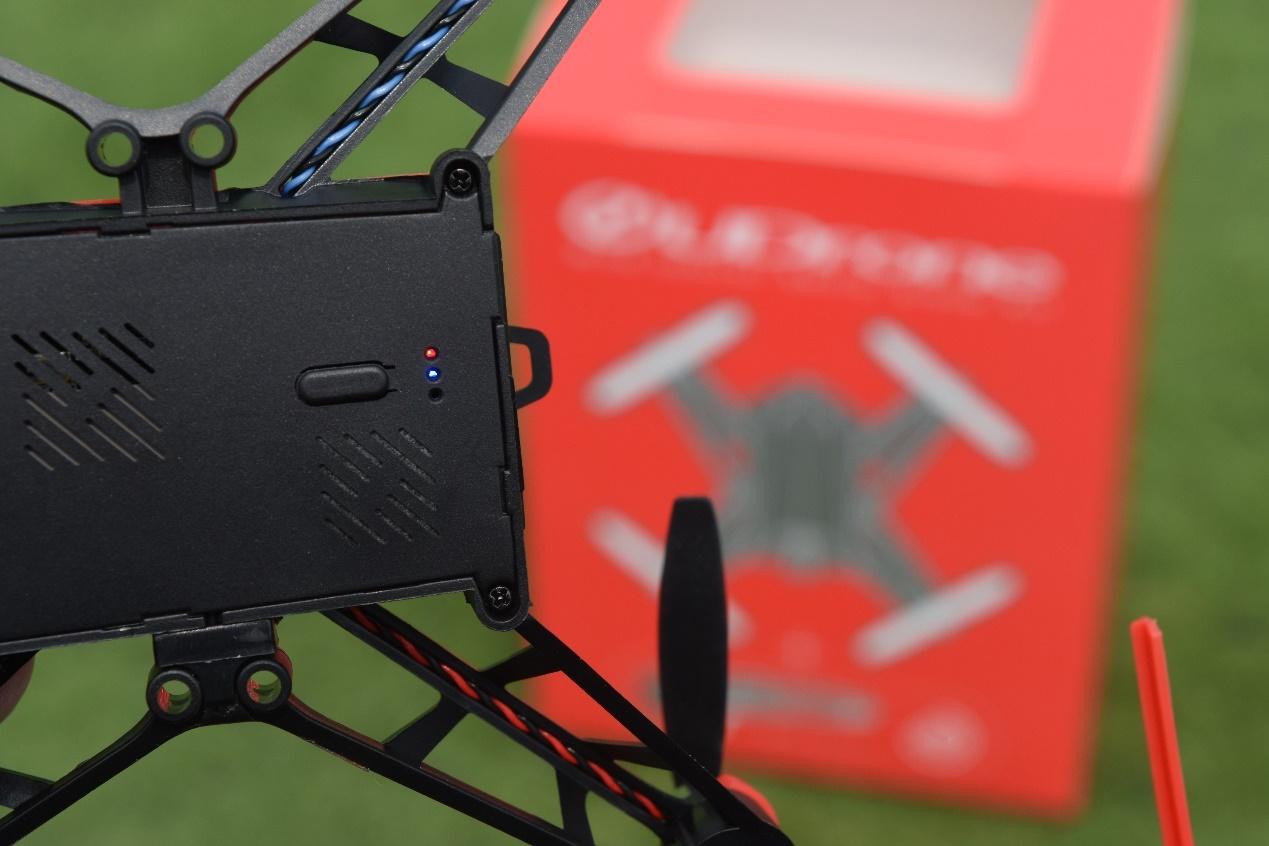 这是UDrone意念无人机电池正面设计情况,有些类似高铁的设计,不过切面设计更多,上方的两只眼睛内置有蓝色的指示灯,正常开机后会亮起,如果电量低,则变为左侧指示灯单独闪烁。前置镜头为800W像素,可以实现720P实时图传质量,可以拍摄1080P的视频和3840*2160分辨率的图片。