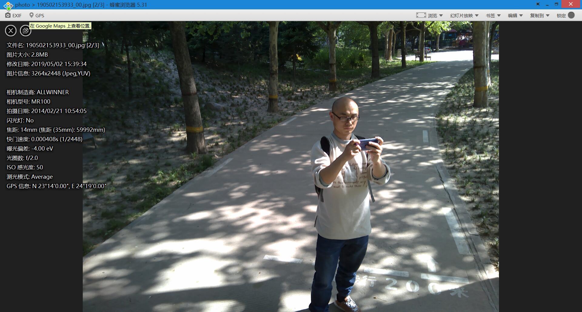 图片格式为jpg,视频格式为mp4。UDrone无人机除了是拍摄的是尺寸为3624*2448的图片外,还有有值得一提的地方,那就是UDrone无人机拍摄的照片加入了GPS信息,但是前提是存在TF卡中的图片。从拍摄的信息来看,相机采用的是全志科技ALLWINNER的摄像头,型号为MR100,这是一款全志科技在2017年发布的高度集成、用于无人机的单芯片。