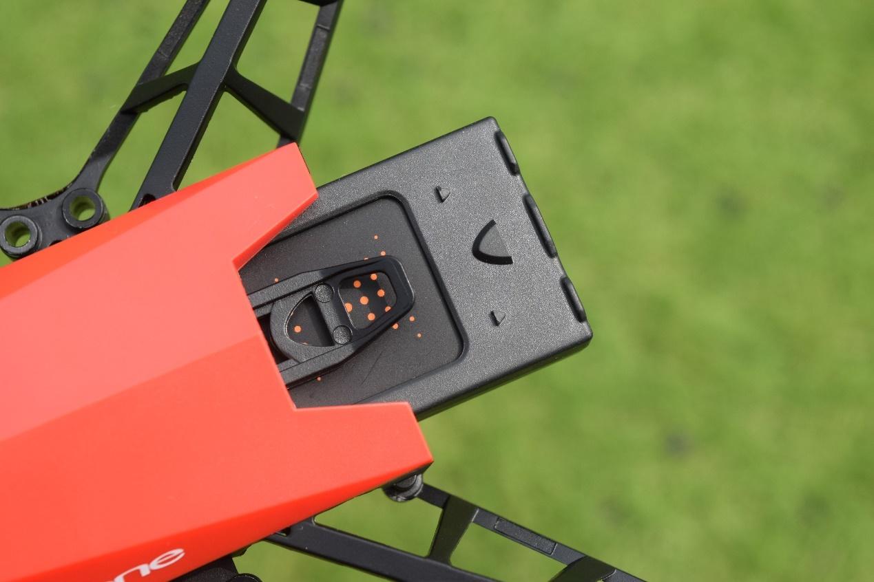UDrone意念无人机电池为可充电锂电池,容量为3.7V/2.4Wh/650mAh,可以连续飞行6~10分钟,视具体操作环境而定。电池有防呆设计,也就是尾部中央的这个三角形标志,用来与机身自带的卡扣进行匹配固定,拔出电池前需要先拉起卡扣。