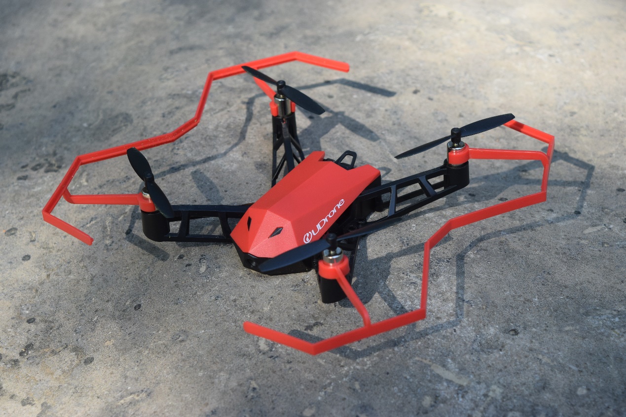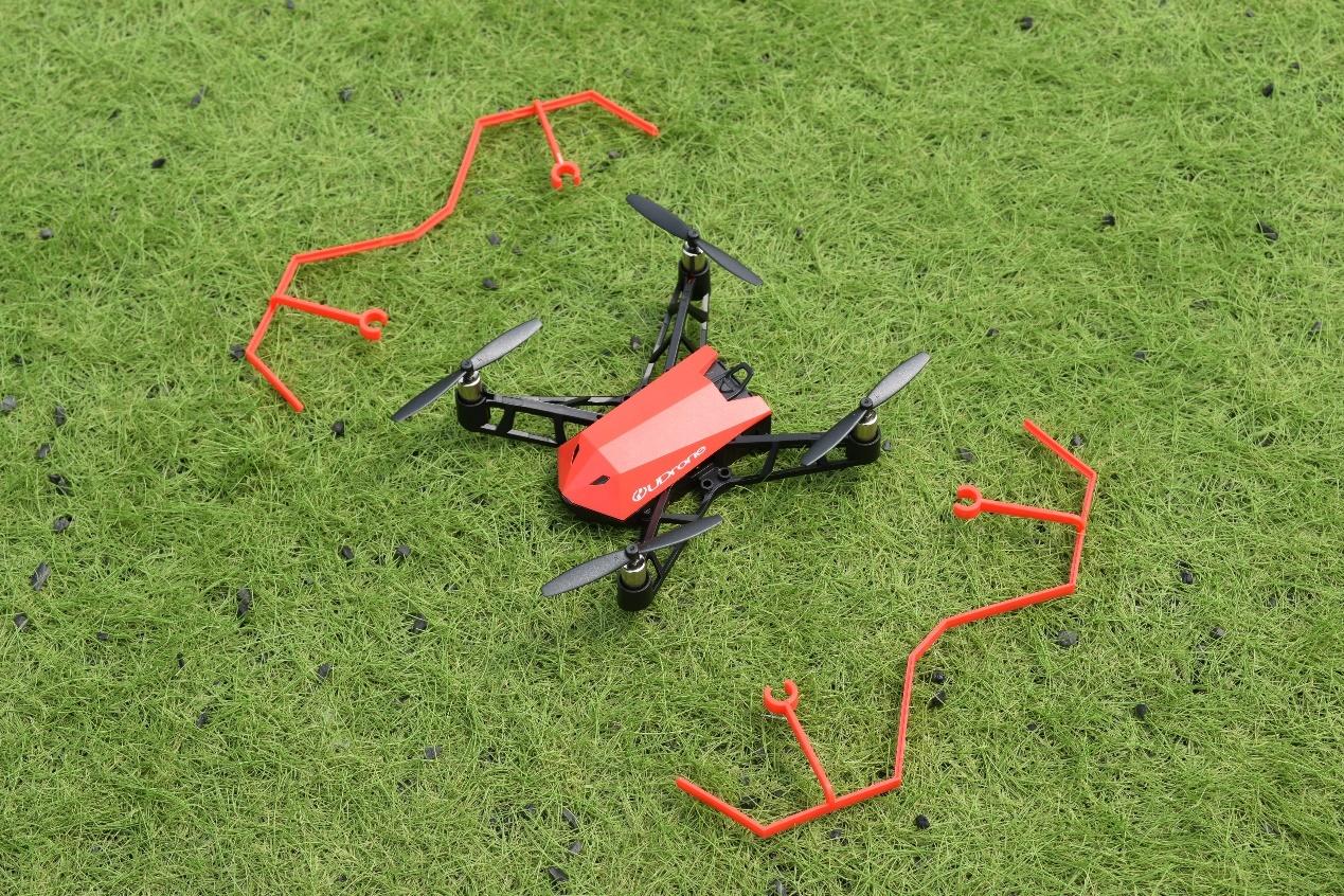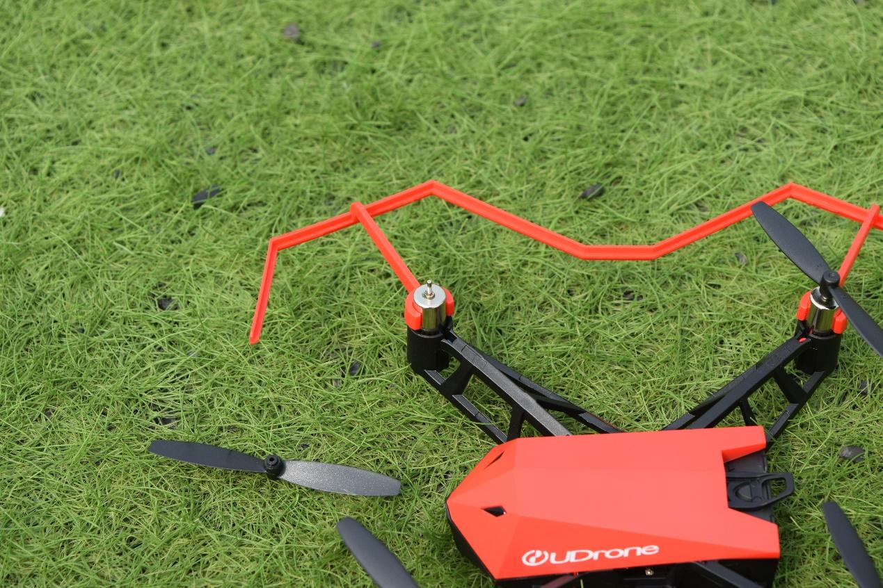UDrone无人机左右两侧的红色保护罩为可拆卸式设计,材质比较软、比较轻,需要手动安装,安装的目的一是为了防止螺旋桨损坏,二是为了避免伤害到人。