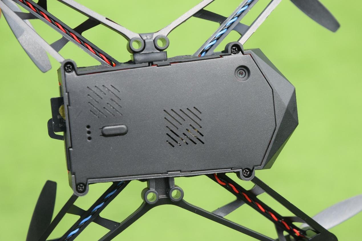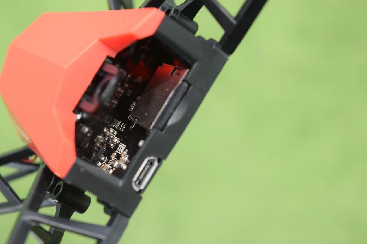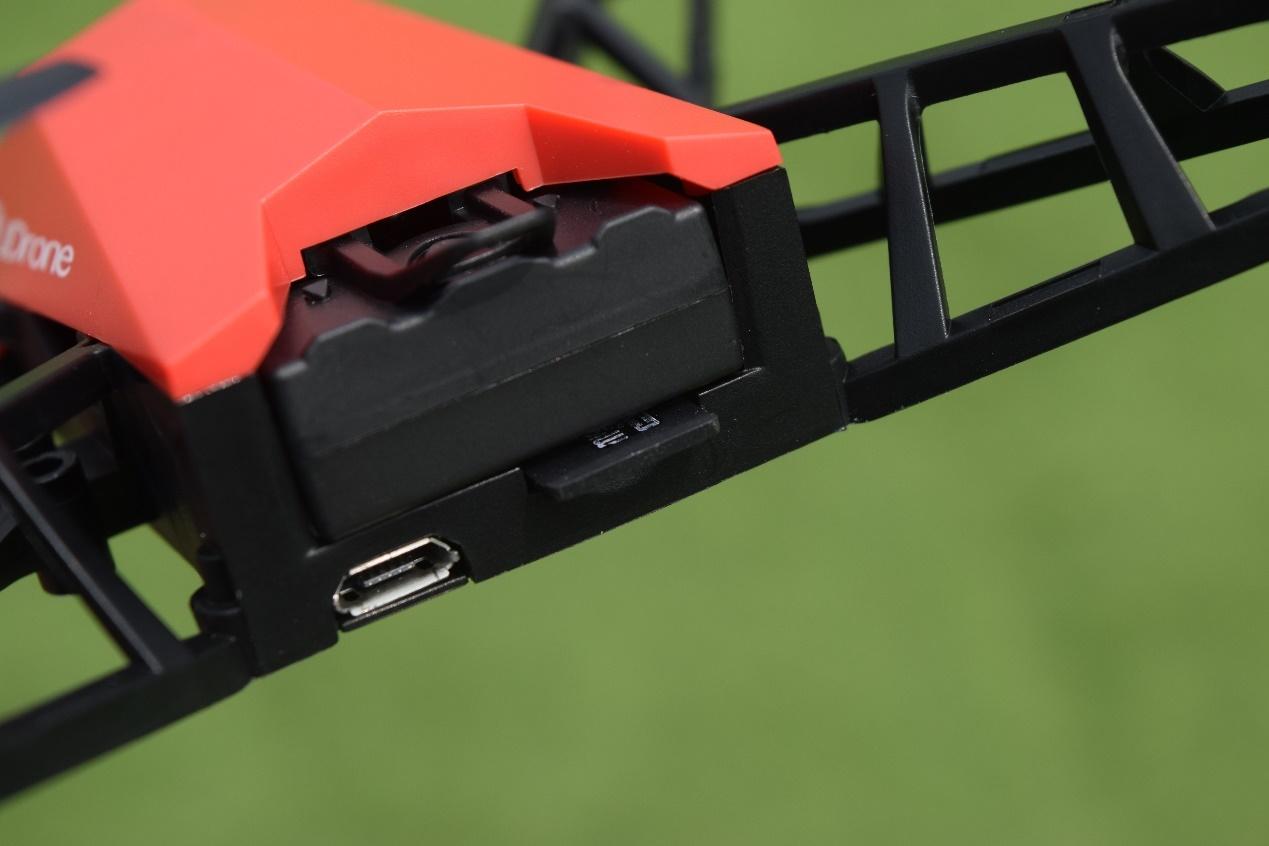 这是UDrone意念无人机尾部安装电池和TF卡的效果图,均为半开放式设计,安装与取下均较为方便,但同时也说明日常使用需要留意防水防尘灯问题。左下角的micro USB接口为充电接口,可以直接搭配移动电源来为无人机进行充电,虽然UDrone意念无人机不具备防水性,但感觉充电接口还是应该加入防水塞设计来避免异物的进入。