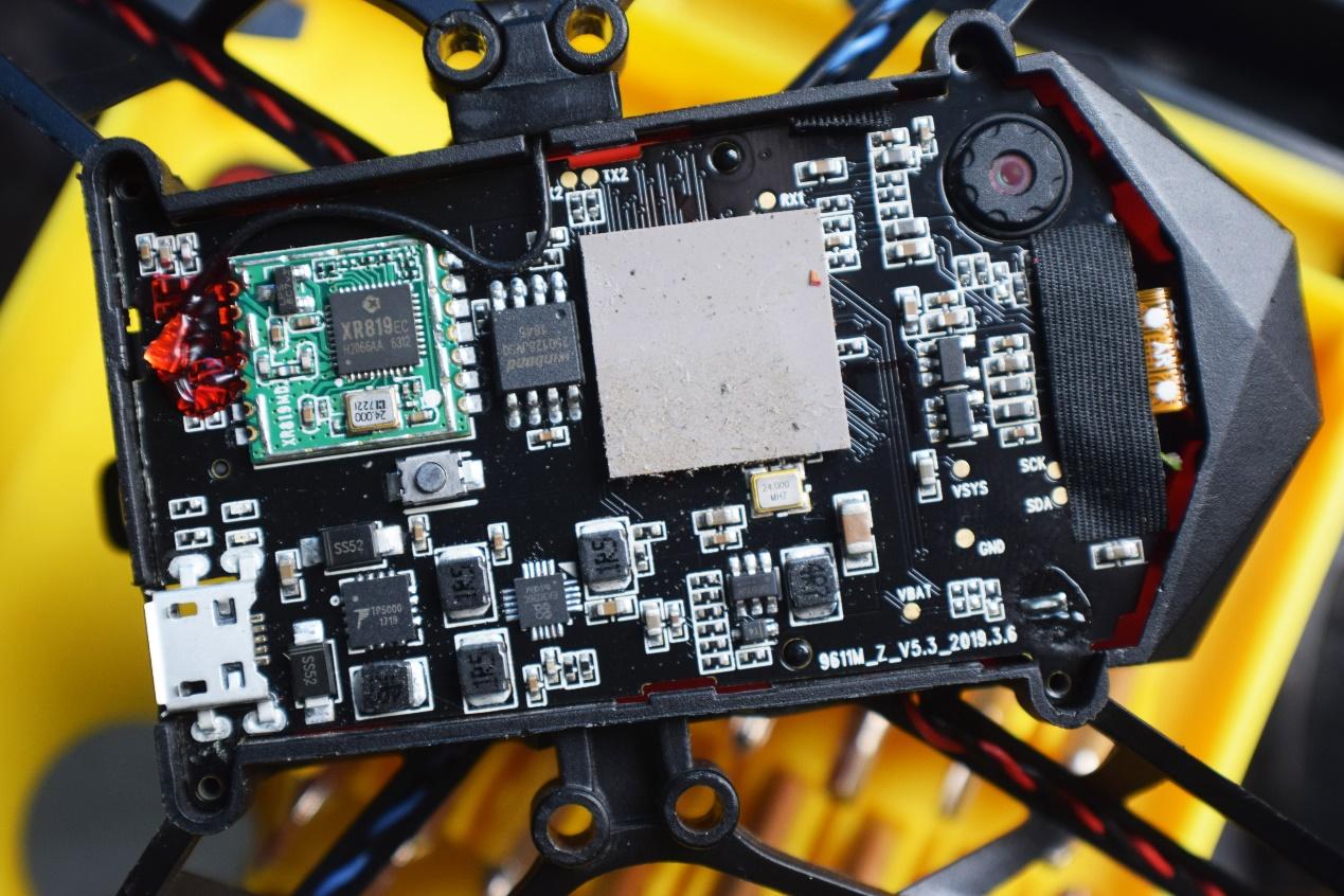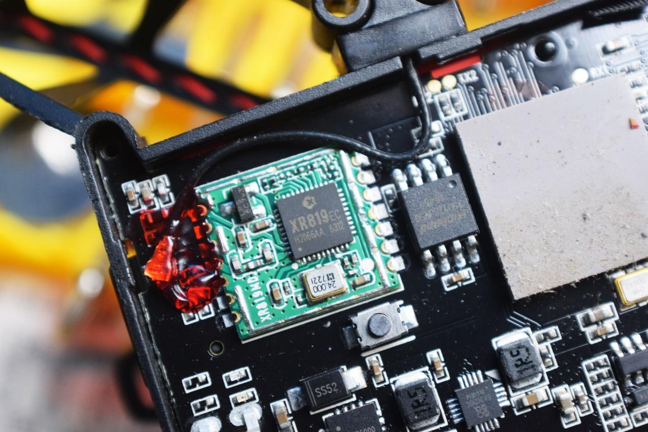 这是拆掉底盖后的展示图,整体而言,主板的部分算是比较干净整洁,没有那种mark笔乱画的廉价感,只是天线的部分用红色的胶水进行了固定。这个能看到的灰色导热硅脂看起来有些脏,原因就是连续几天的飞行测试,掉落到灌木丛、草丛、地面等所导致的。