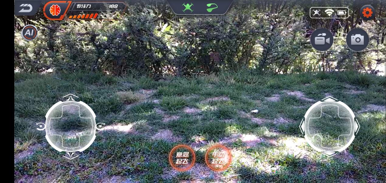 这是APP端的正常实时预览画面,画面为UDrone无人机前方镜头所看到的画面。该预览画面下可以看到意念值,UDrone无人机和UMindLite意念机的连接状态,无人机的电池电量情况和WiFi信号强度,录影与拍照功能以及模式切换功能。在起飞方式上分为两种,一种就是最值得体验的意念起飞,对应的是UMindLite意念机图标;另一种就是常见的手动起飞模式,对应的UDrone无人机图标,两者最大的部分不同就是前者不再用手进行操作,完全就是意念力和体感模式,后者就是单纯的手动操作。