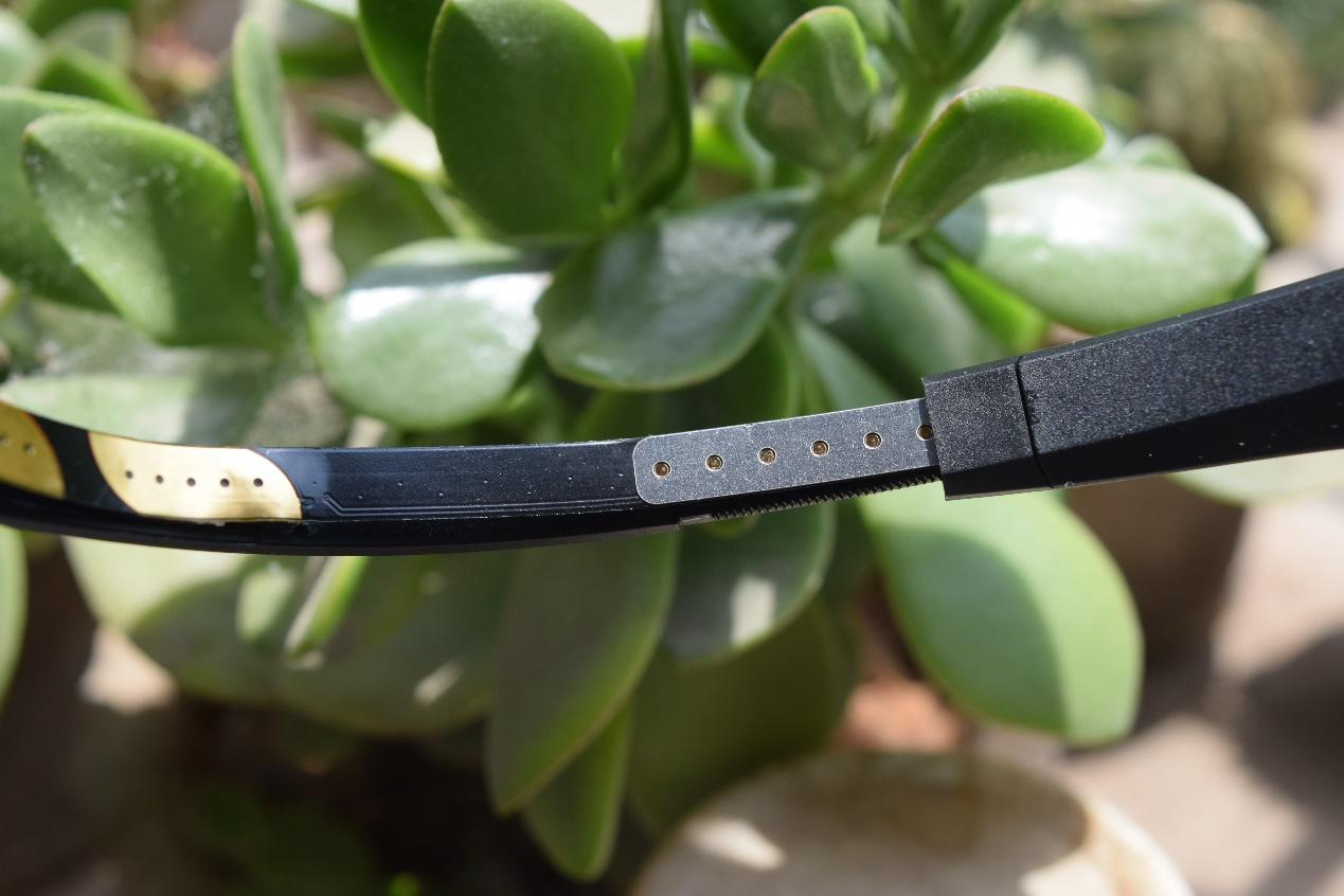 另外两个金属片则是隐藏式设计,位于末端的位置,需要拉伸来调节长度后才可以看到,支持的头围范围是50厘米到70厘米。