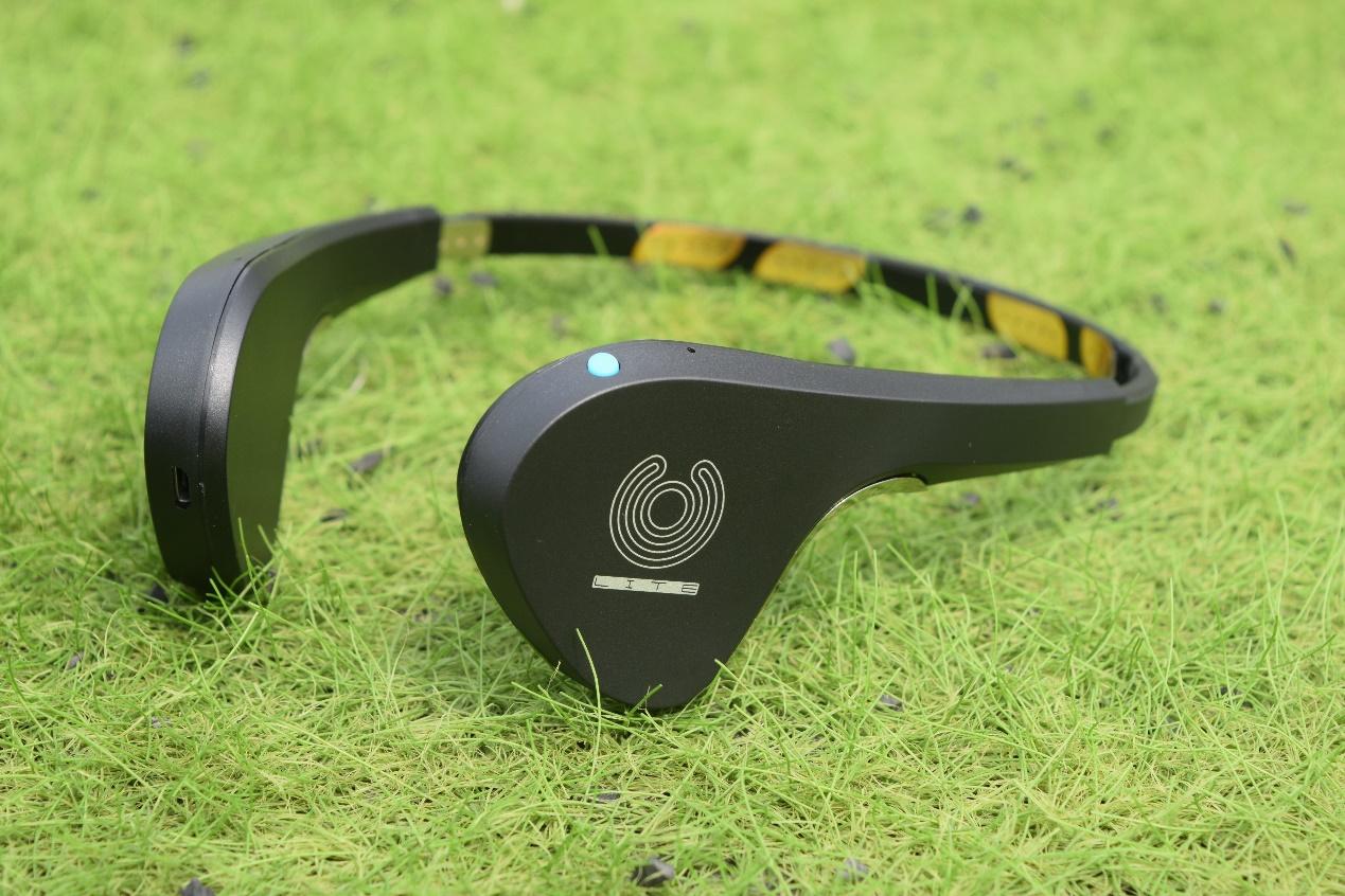 再来说说搭配使用的UMind Lite意念机,用来体验意念控制无人机的核心,当然这是硬件的基础部分,还需要搭配APP来使用。UMind Lite意念机自身重量只有77克,与无人机重量相近,它采用脑机接口技术,通过测量脑电波活动以及跟踪轻微面部动作来将这些信号转换为指令并控制无人机的动作,这样就实现了通过意念来控制无人机起飞、调整高度以及稳定飞行的目的。左侧顶部位置的天蓝色按键就是电源键,一侧的圆孔为状态指示灯。