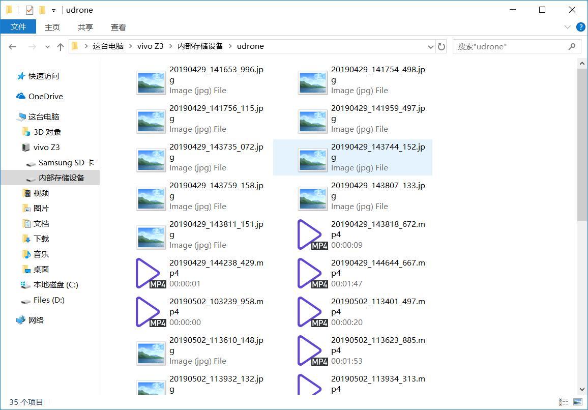 接着来说说存储和视频图片的部分。存储的部分分为两个,一个是TF卡,一个是APP端。TF卡端会分为photo和Video两个文件夹进行区分,但APP端存储在手机内部则只有一个文件夹,那就是名称为udrone的文件夹,图片和视频会同一放置在此文件夹下。